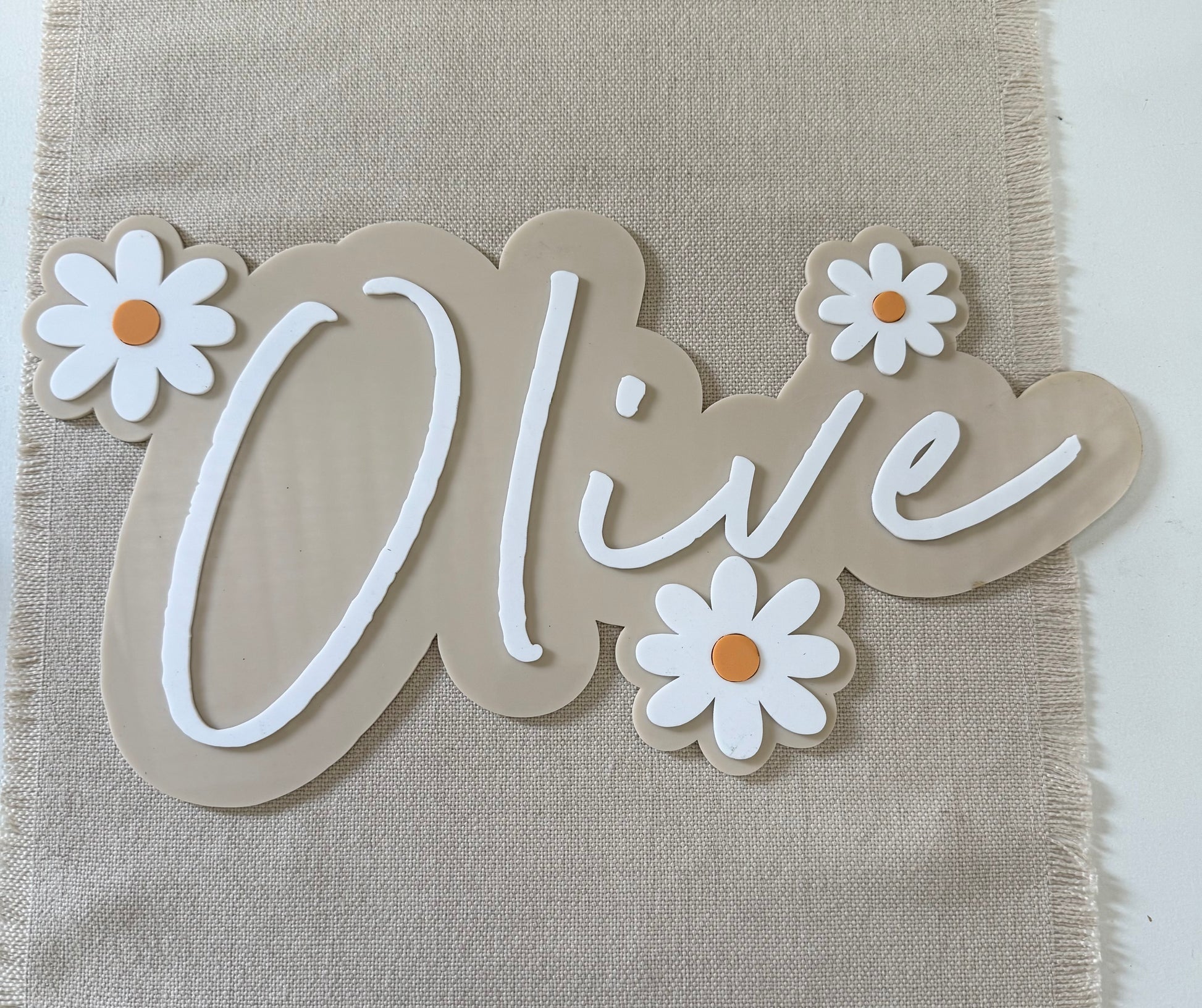 Crafted with layered detail, this sign features your child’s name in a flowing script font, surrounded by playful daisy embellishments for a fresh, whimsical finish. Perfect for hanging above a cot, bed, or play area, it instantly transforms any space into a warm and inviting haven.