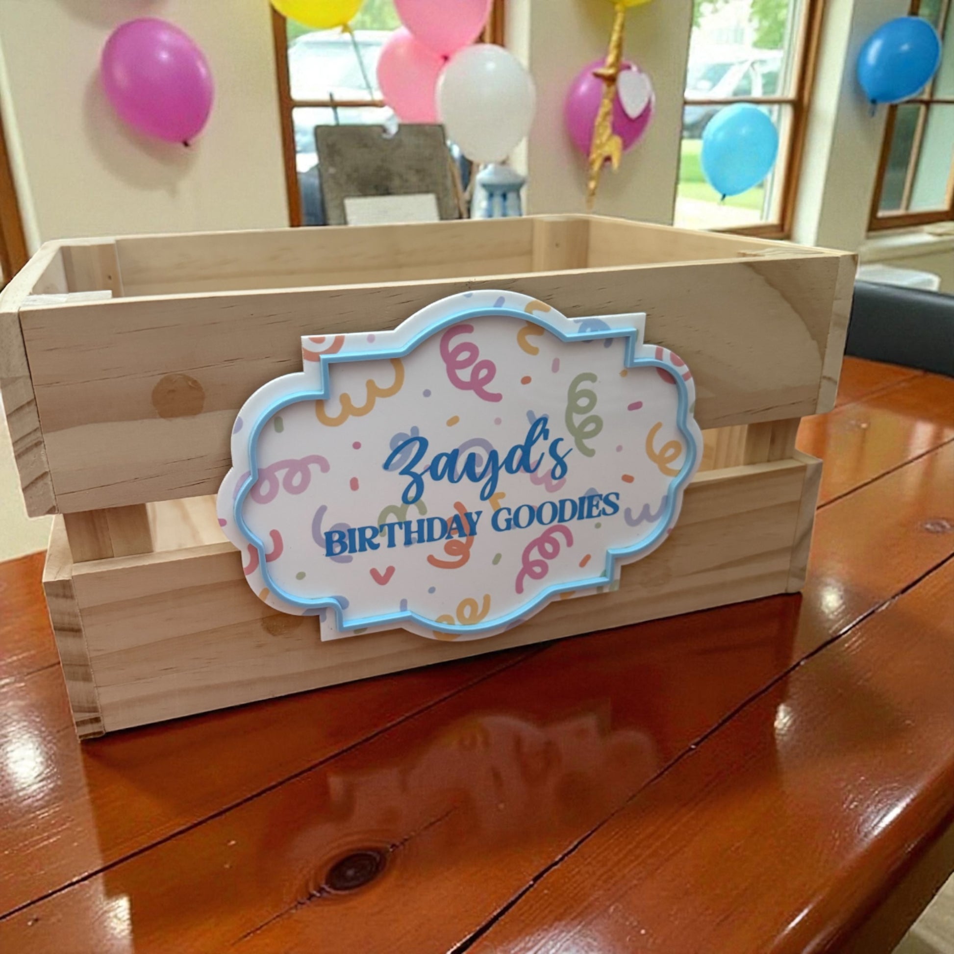 Our interchangeable seasonal crate set includes a beautiful wooden crate plus UV-printed acrylic plaques for each special occasion: